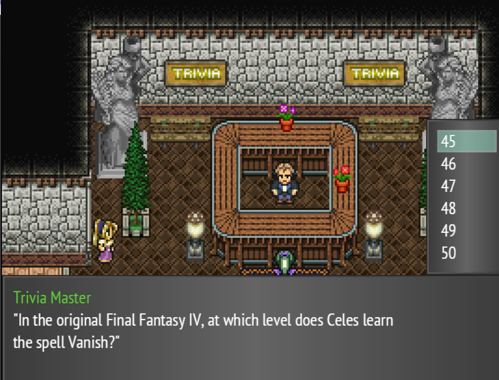 Great game,having lot of fun despite being horrible at it. Have been doing trivia for the last hours. Though,I just want to note,but as someone with a basic understanding of the first 6 final fantasy ... I don't think Celes is from IV(I think I also saw it with Terra but haven't seen that question since.)